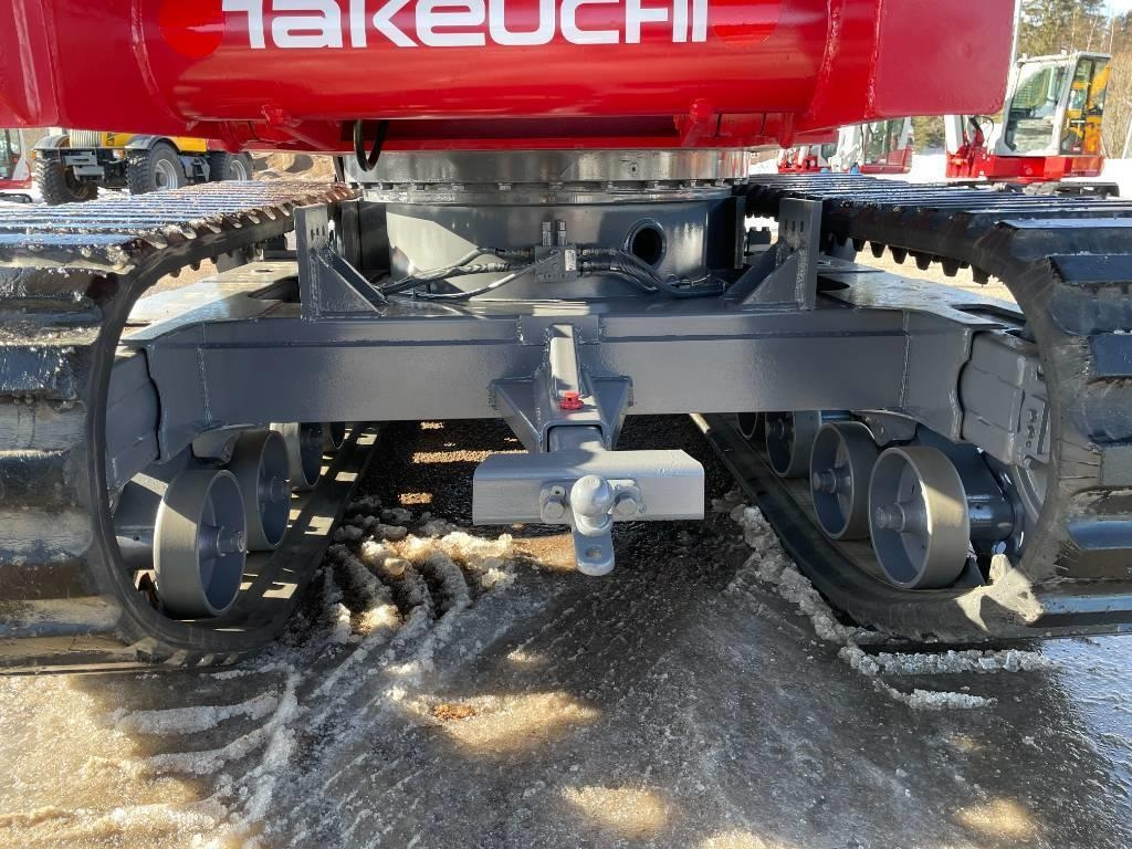 Suurin turvallinen kuorma 3, 7t, 450mm telat, Maavara 435mm, 180 astetta pyörivä lava eli kummallekkin sivulle pystyy kippaamaan, tuttu tarkka ja pehmeä esiohjattu Takeuchi hydrauliikka, majakka, vetokoukku, Akun erotin, Lisävarusteet, Lämmitettävä ohjaamo