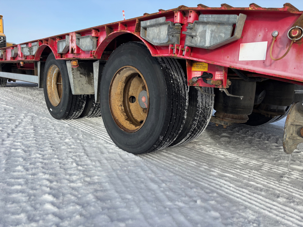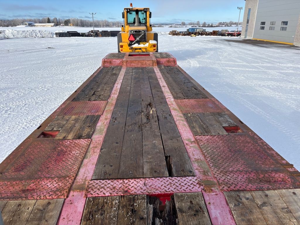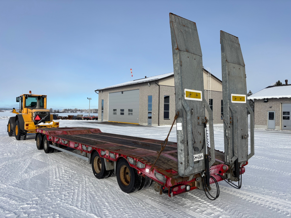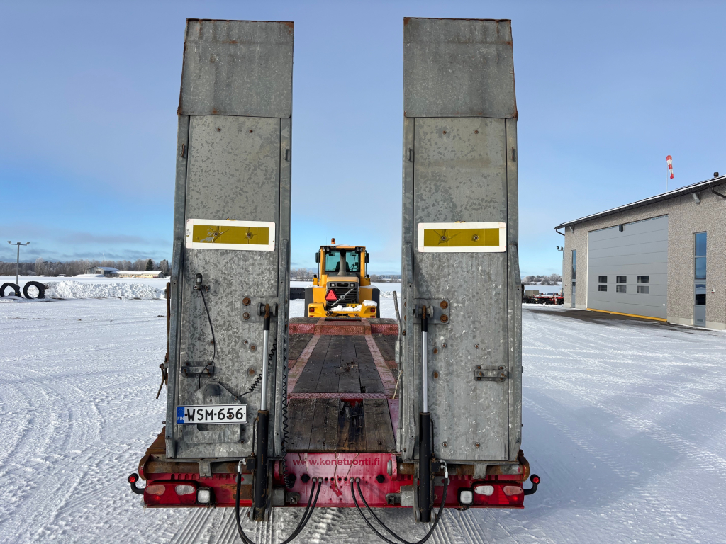 Ikäisekseen siisti 4-akselinen täysperävaunulavetti, kannen pituus 9,8m, leveys 2,55m + levikkeet, lastauskorkeus noin 0,88m, ilmajouset, SAF-akselit, hydrauliset ajosillat (vaatii autosta hydrauliikan), hyvät renkaat, rekisteröity varsinaiseksi perävaunuksi jolloin kokonaismassa 36 000kg, omamassa 8 490kg, kantavuus 27 510kg, seuraava katsastus 09.12.2026 mennessä.