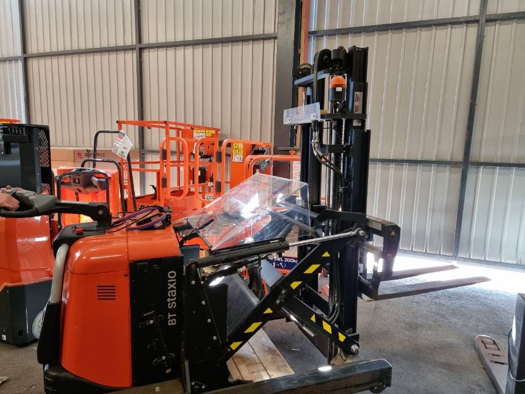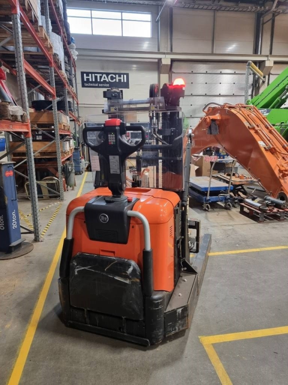 Hyvässä kunnossa ja pienillä tunneilla oleva erikoiskone. Kuin työntömastotrukki asetinlaitteella, mutta perässä käveltävänä pinoamistrukkina.