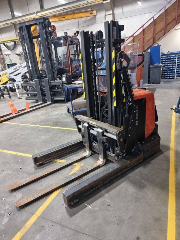 Hyvässä kunnossa ja pienillä tunneilla oleva erikoiskone. Kuin työntömastotrukki asetinlaitteella, mutta perässä käveltävänä pinoamistrukkina.